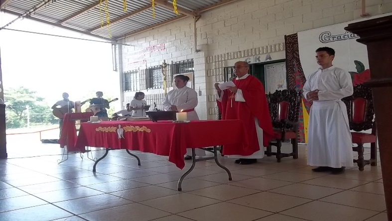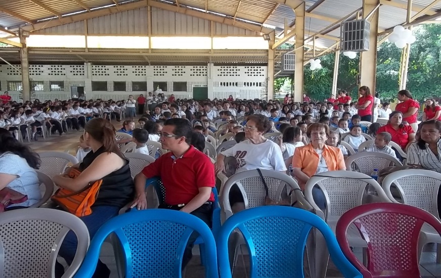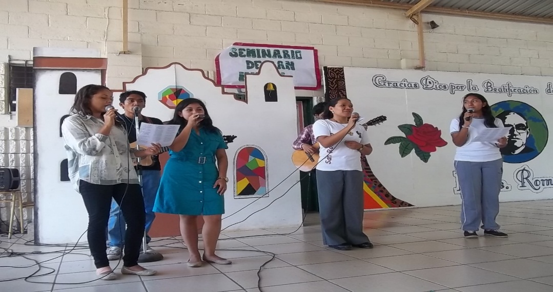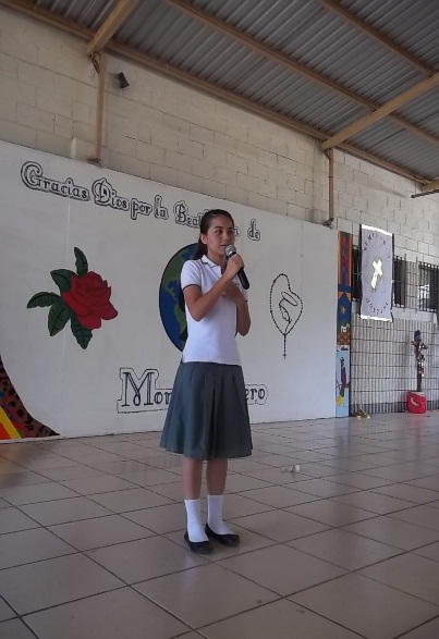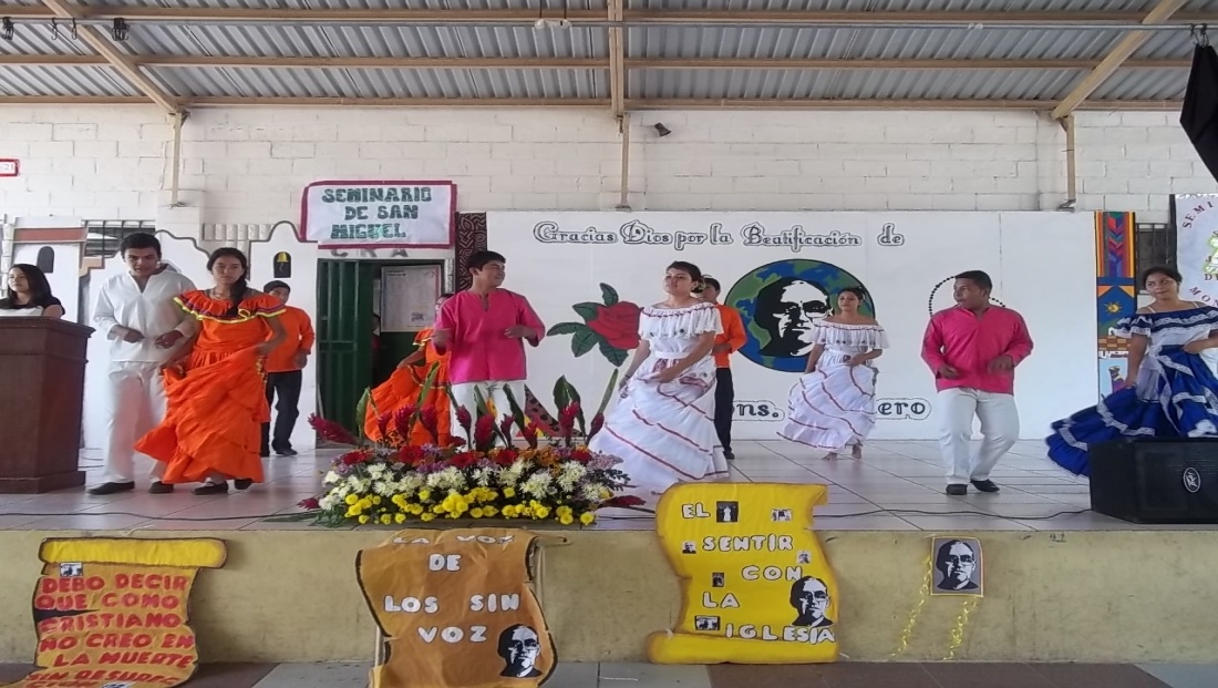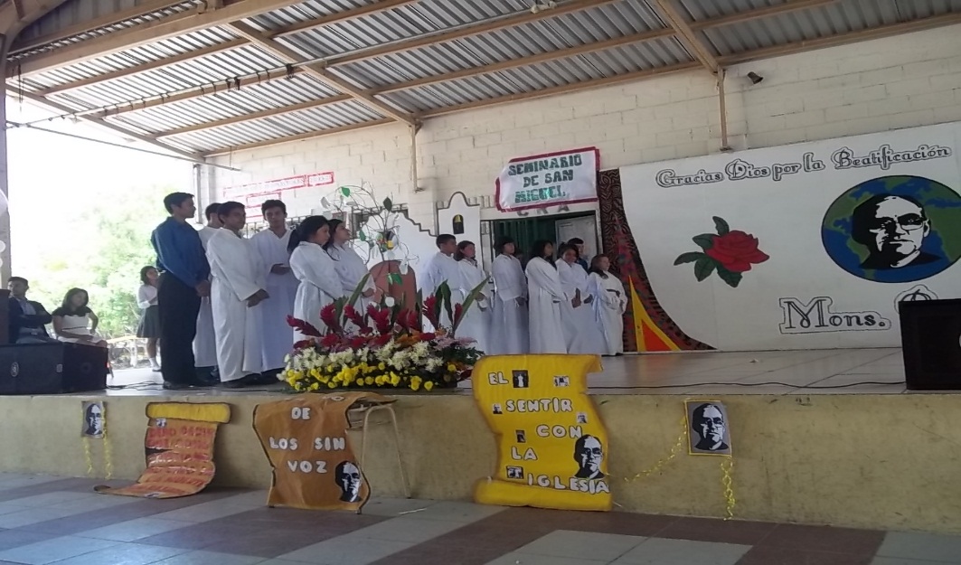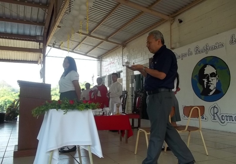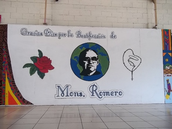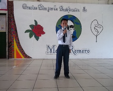 On May 22nd, 2015, COAR’s 900+ students celebrated the life and sacrifice of Oscar Romero.  The following day, in San Salvador, 250,000 stood in the baking hot sun – happily – awaiting the message from Pope Francis that Oscar Romero was finally Beato Romero!  Back at COAR, there was a lovely Holy Mass. Friday was a celebration of the man who served God by serving the people of El Salvador.  There was a student produced skit that recounted the years of Romero’s life in the Church.  There was a Colonial Era folk dance in era-appropriate costumes, a local inspiration band, and countless students who presented songs and poems in his honor.  The school was decorated in yellow and white.  Romero’s bust by the front door was arched by balloons and draped in gorgeous red flowers.