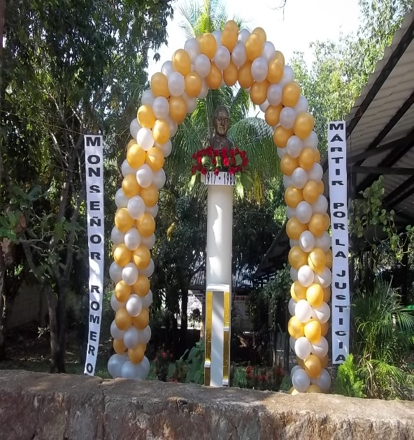 On May 22nd, 2015, COAR’s 900+ students celebrated the life and sacrifice of Oscar Romero. The following day, in San Salvador, 250,000 stood in the baking hot sun – happily – awaiting the message from Pope Francis that Oscar Romero was finally Beato Romero! Back at COAR, there was a lovely Holy Mass. Friday was a celebration of the man who served God by serving the people of El Salvador. There was a student produced skit that recounted the years of Romero’s life in the Church. There was a Colonial Era folk dance in era-appropriate costumes, a local inspiration band, and countless students who presented songs and poems in his honor. The school was decorated in yellow and white. Romero’s bust by the front door was arched by balloons and draped in gorgeous red flowers.