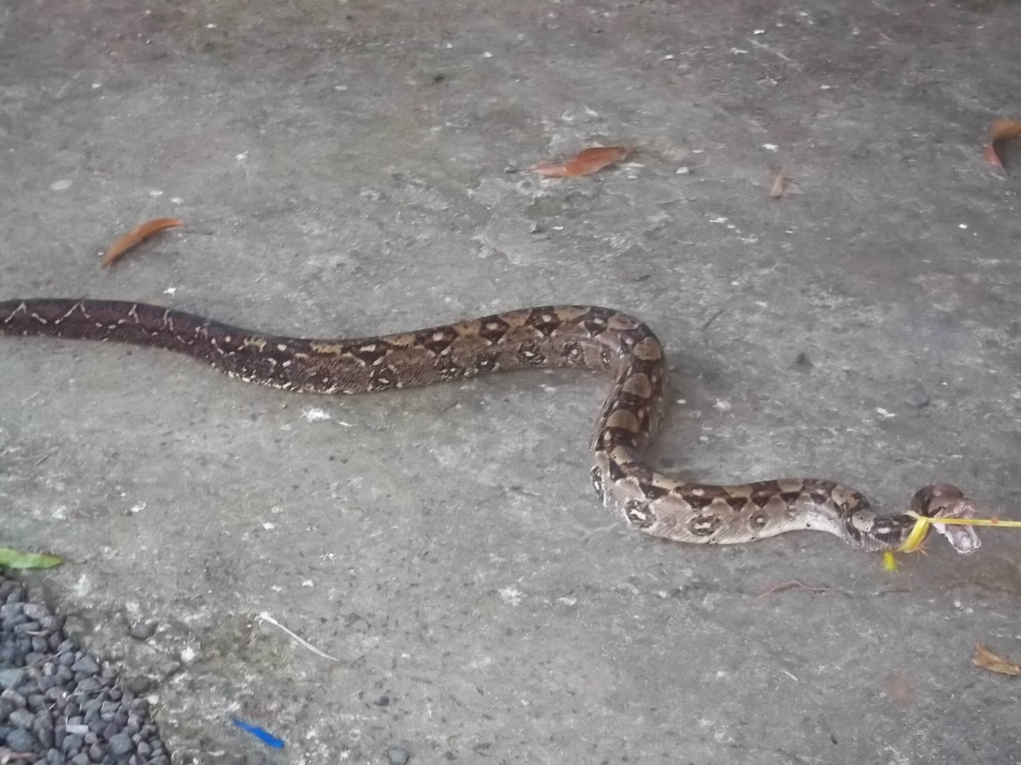 After some study, he realized that constrictors had found a way to enter the pipes that run into the shelter. They entered the pipes at night, ate the rabbits and made their escape before day break. Having discovered their ‘modus operandi’, our farmer set a trap and as you can see from the picture, caught one of the rabbit thieves before he could do any more harm.